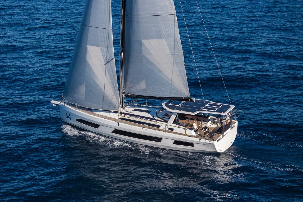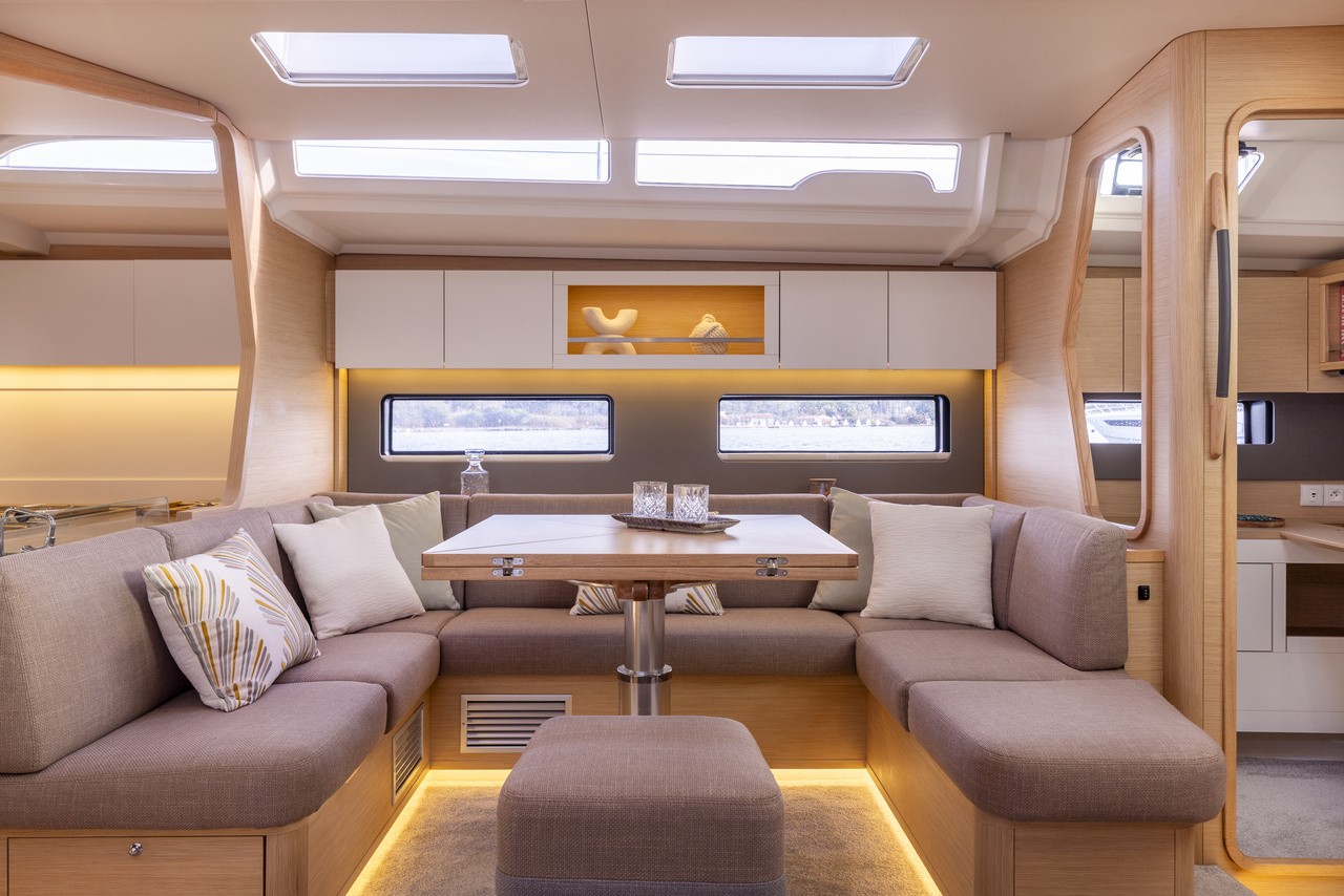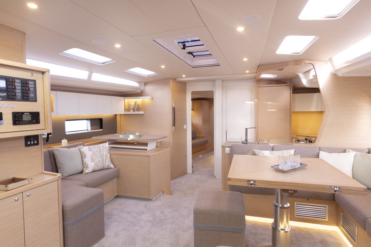 The interior of the Dufour 54 features a thoughtful layout with high-quality materials and options for different arrangements, such as three or four cabins. The design prioritizes comfort and natural light, with large windows that provide extensive views of the sea and sky.