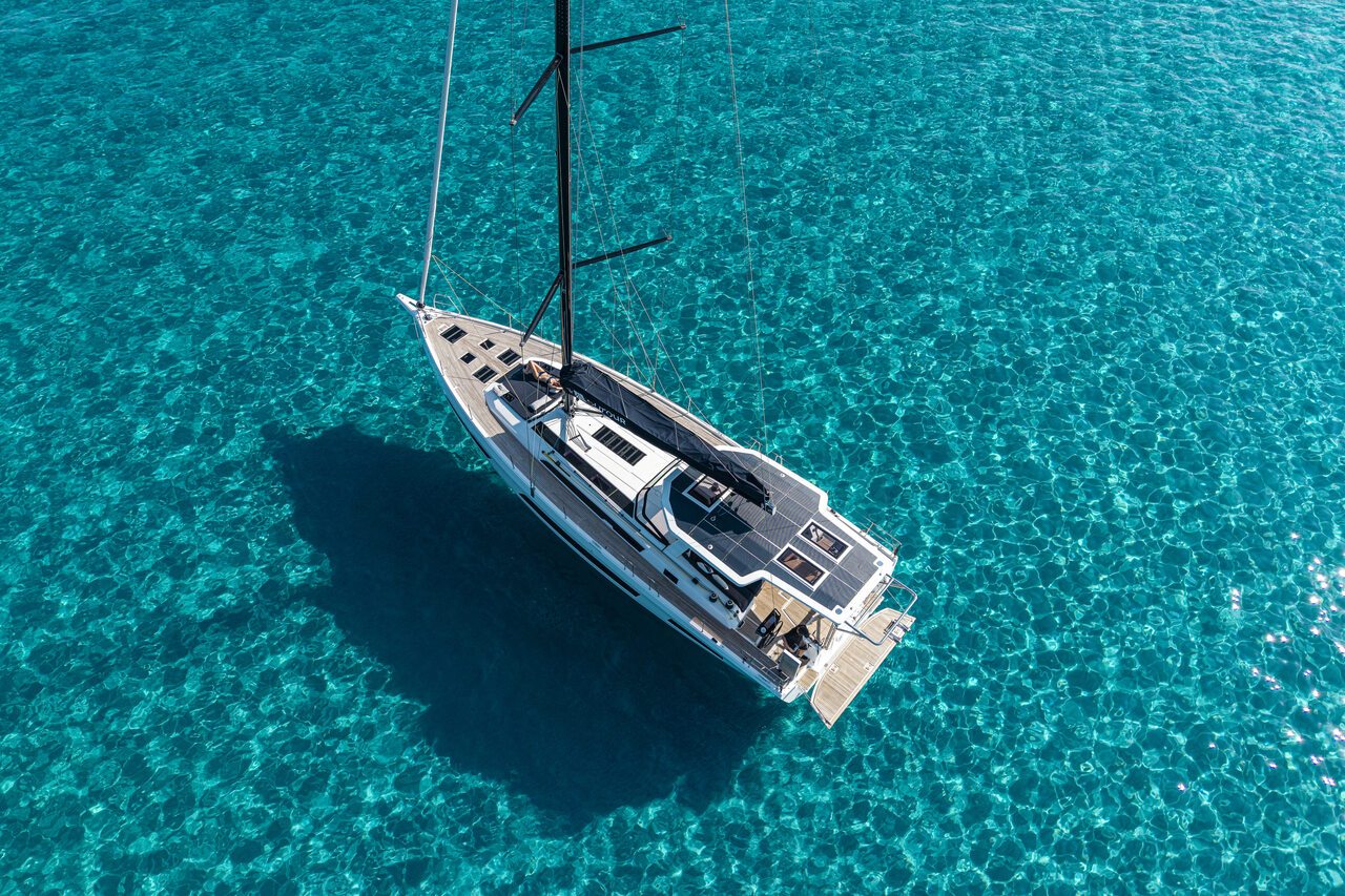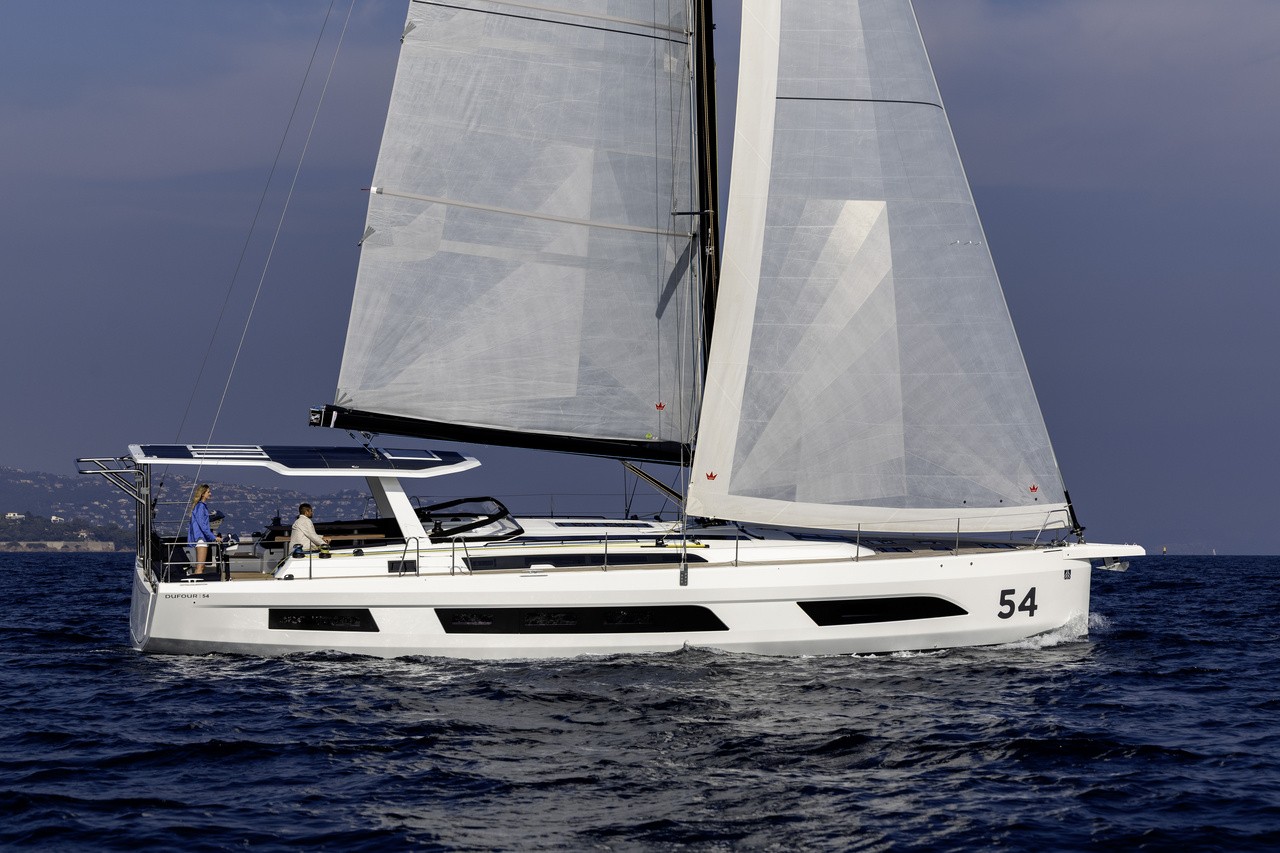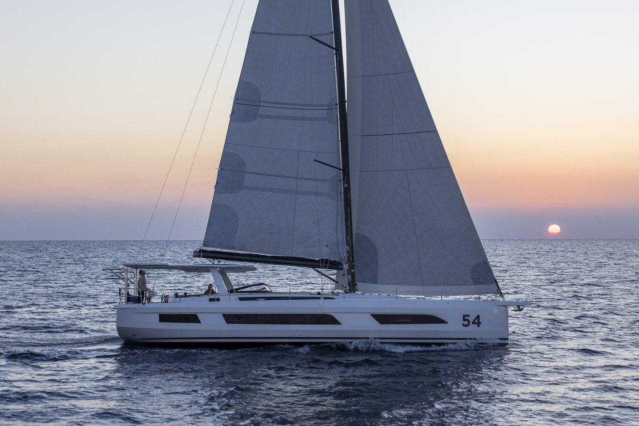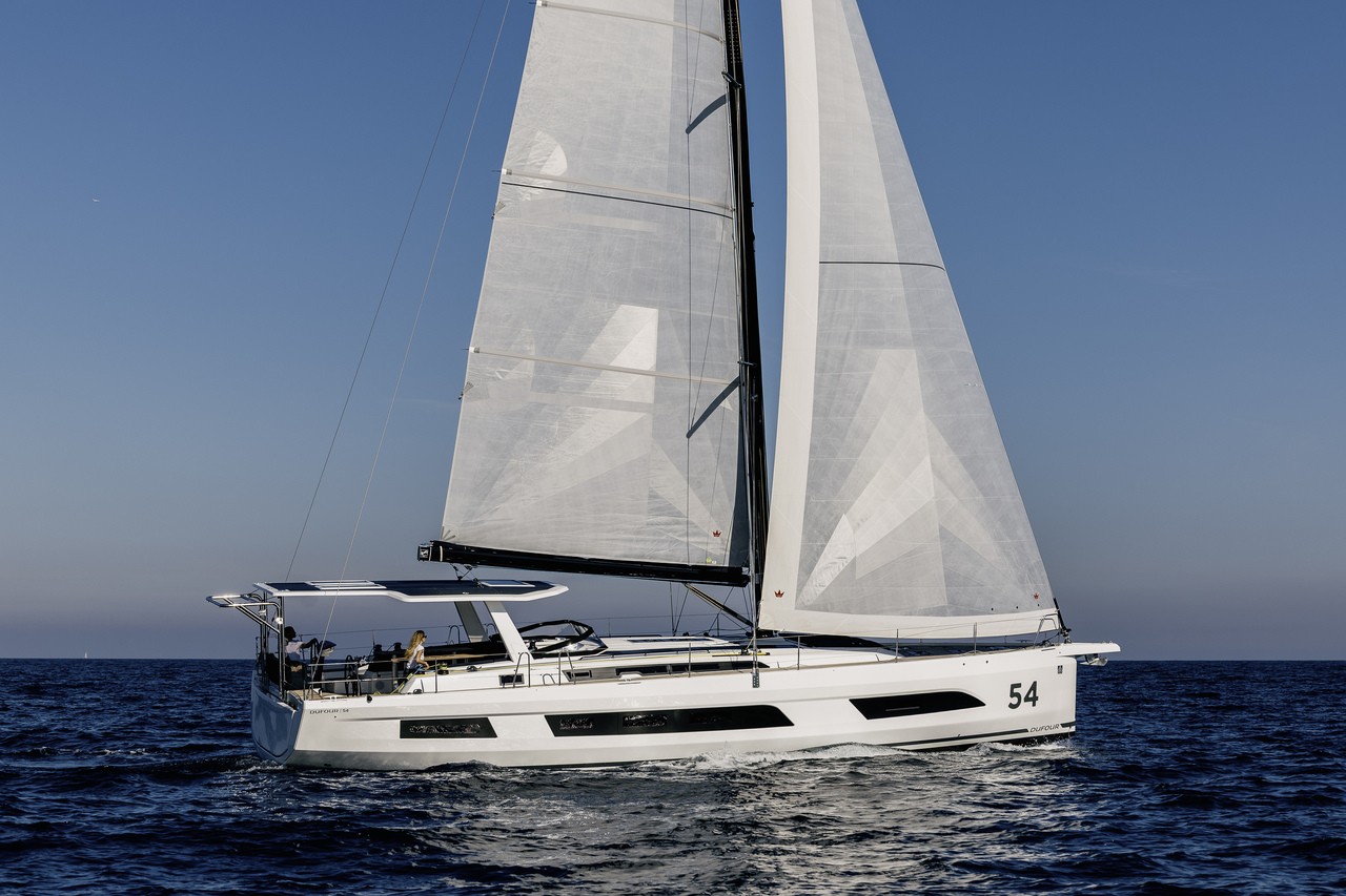 The interior of the Dufour 54 features a thoughtful layout with high-quality materials and options for different arrangements, such as three or four cabins. The design prioritizes comfort and natural light, with large windows that provide extensive views of the sea and sky.
