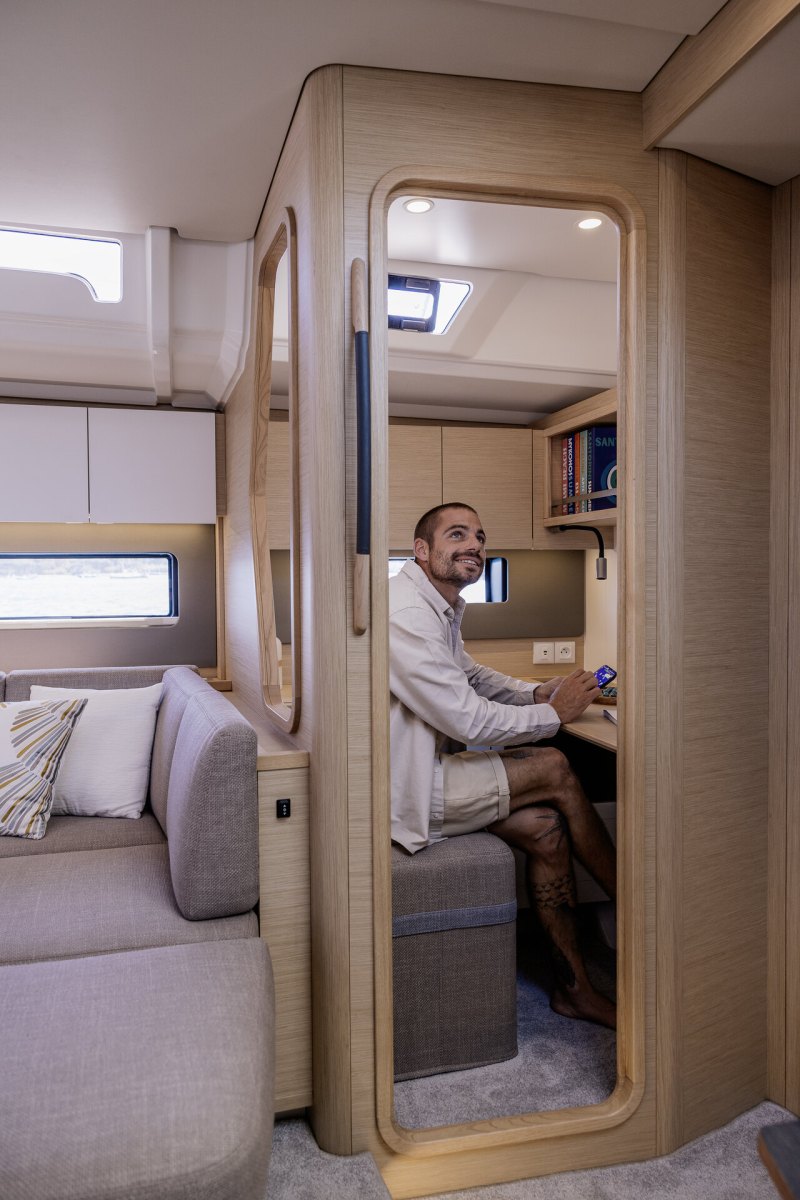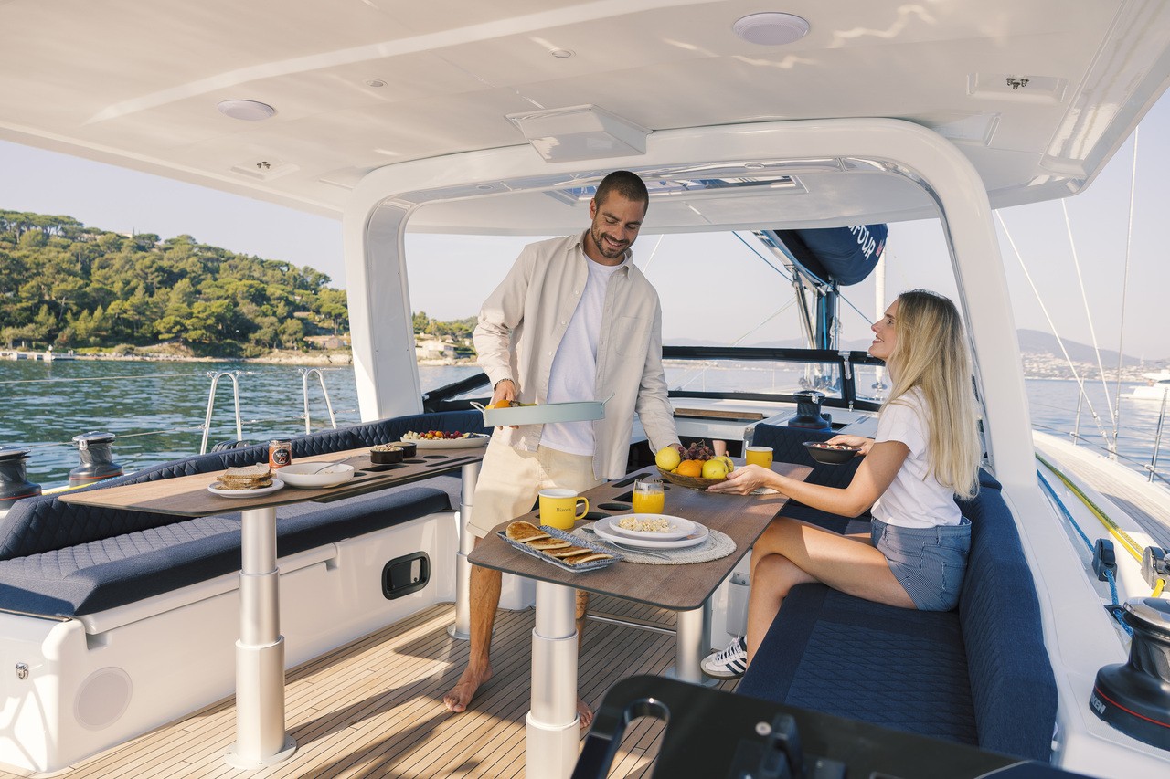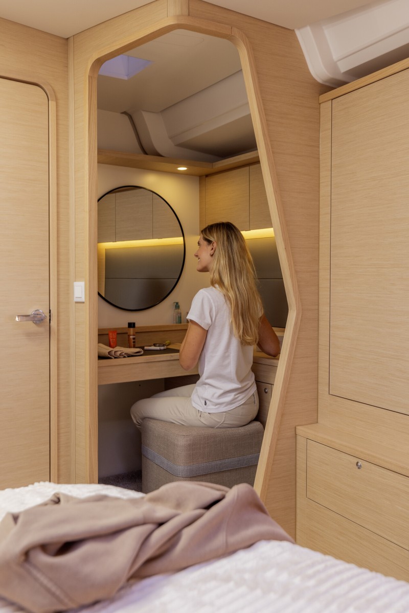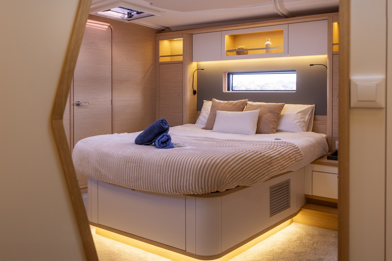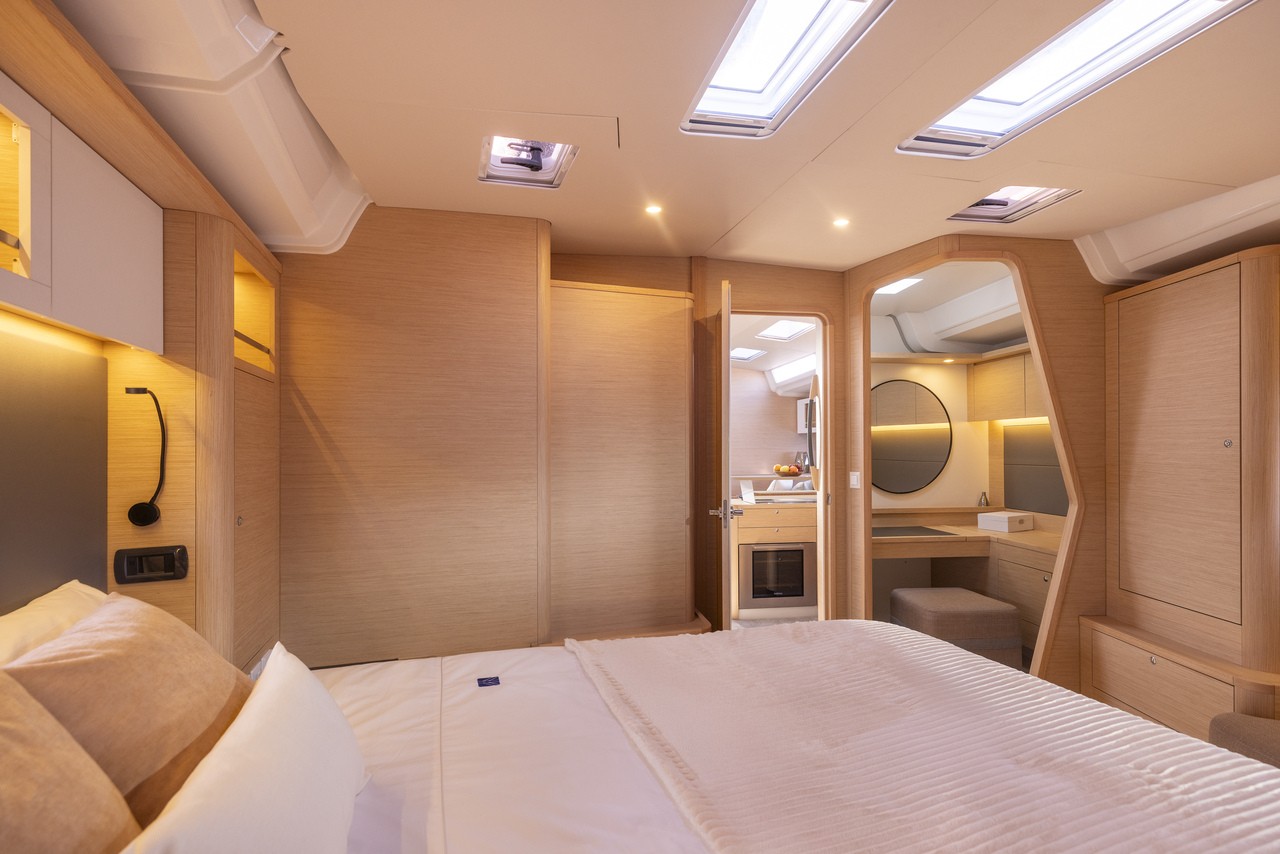 Forward cabins are designed to maximize space and comfort, available as either a traditional owner’s cabin with a double bed and bathroom or a more spacious owner’s suite. The placement of the bathrooms varies depending on the layout, either aft or forward, to make the most of the available space. Large coachroof windows provide ample natural light and views, creating a cozy, private environment, especially in the forward area.